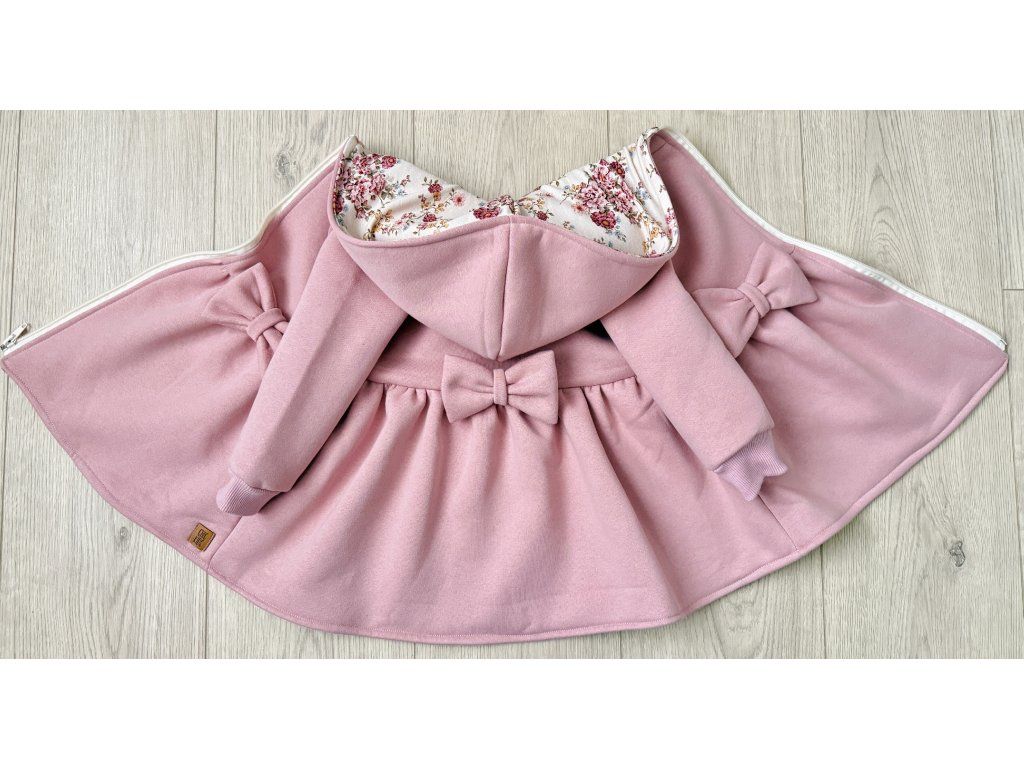 • Svetloružový kabátik s kapucňou – jemný materiál, biela zipsová línia, ozdobné mašličky na prednej strane.