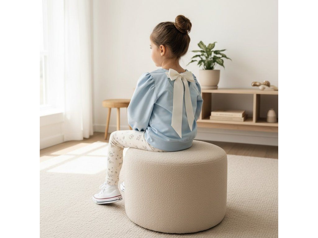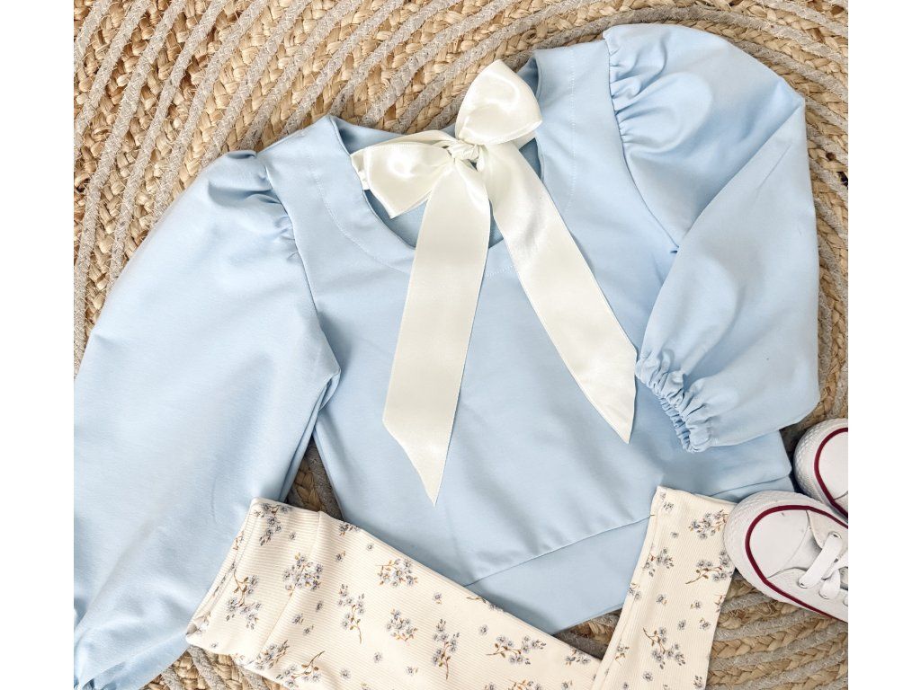 Táto jemná dievčenská mikina v pastelovo modrej farbe je ideálnym kúskom na každodenné nosenie aj špeciálne príležitosti. Má nadýchané rukávy, ktoré dodávajú outfitu elegantný a hravý vzhľad, a výraznú saténovú mašľu pri krku, ktorá pôsobí štýlovo a originálne.
