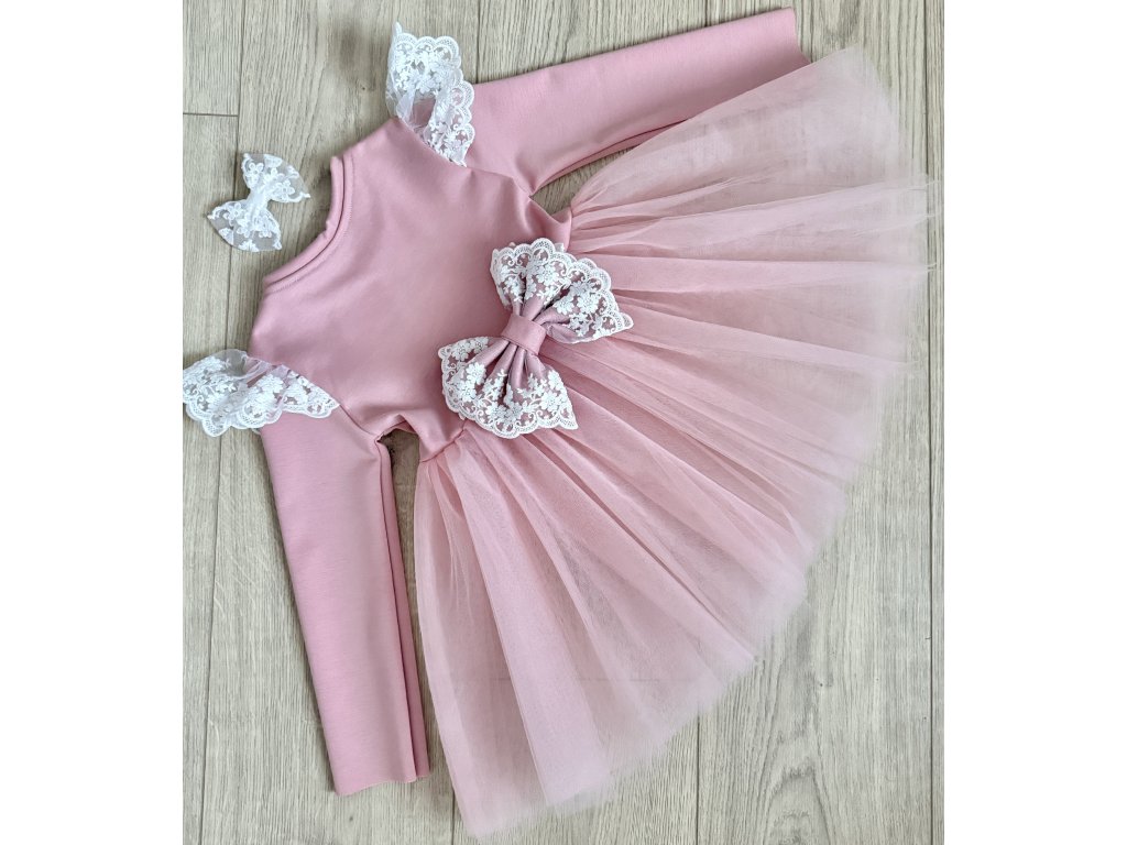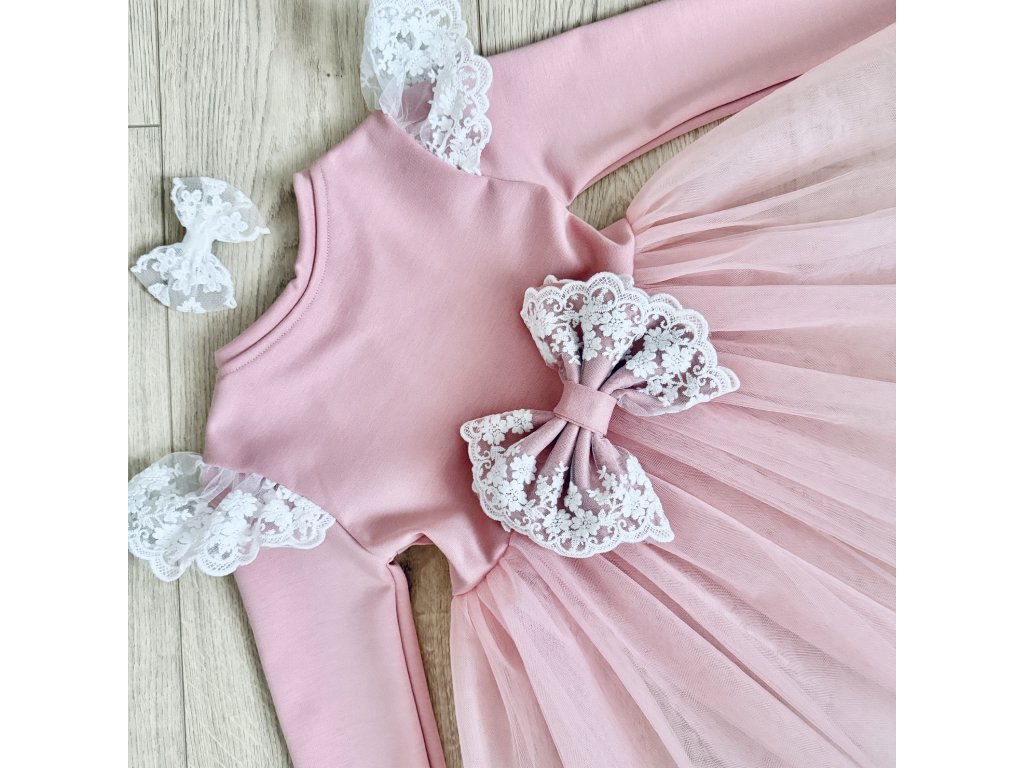 Rozkošné dievčenské šaty v jemnej ružovej farbe sú ideálnou voľbou na krstiny, narodeninovú oslavu, svadbu či vianočné fotenie. Kombinujú nadýchanú tylovú sukňu so zdobením z bielej čipky na ramenách a veľkou mašľou v páse, ktorá dodáva šatám elegantný a slávnostný vzhľad. Zladená čipková mašlička do vlasov, vďaka ktorej bude outfit dokonale zladený je k zakúpeniu TU.
