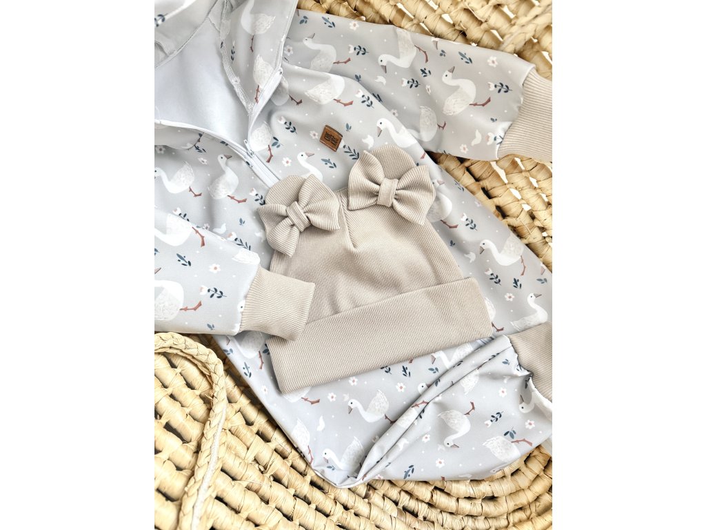 Tento set z kvalitného rebrovaného úpletu je navrhnutý tak, aby poskytoval maximálne pohodlie a zároveň pôsobil esteticky a harmonicky. Čiapka krásne prilieha, je príjemne pružná a zdobia ju dve ručne tvarované mašličky z rovnakého materiálu — detail, ktorý setu dodáva jemnosť a osobitosť.