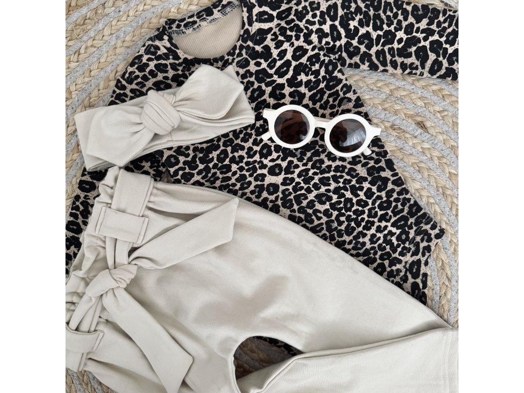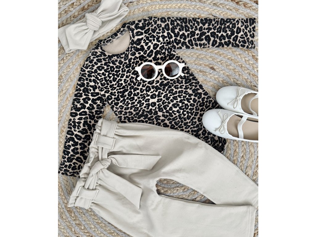 Štýlový detský set, ktorý poteší každú malú parádnicu. Pohodlný top s dlhým rukávom v leopard vzore krásne ladí s béžovými nohavicami s viazaním v páse a dopĺňa ho mäkká čelenka s mašľou v rovnakom odtieni. Outfit je nielen trendy, ale aj pohodlný na každodenné nosenie či špeciálne príležitosti. (Okuliare a topánky nie sú súčasťou setu.)