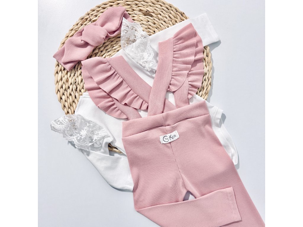 Výnimočný set rebrovaných legín s volánikmi na traky a body s krajkovým volánikom pre malé parádnice. Celý set je ušitý z bavlneného materiálu takže je vhodný aj pre tie najmenšie dievčatká.