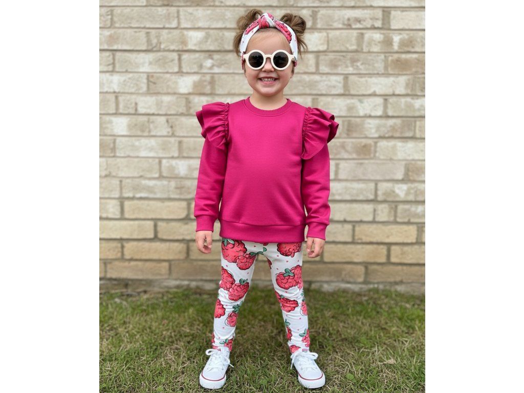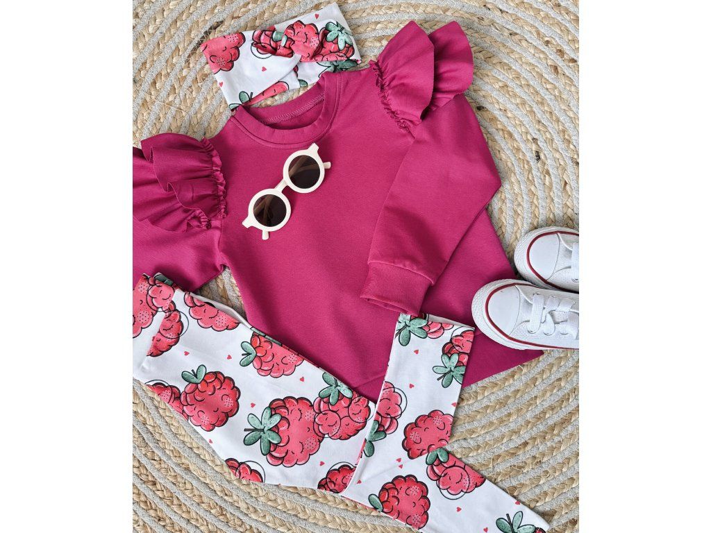 Tento hravý set pre dievčatká spája pohodlie a originálny dizajn. Magentová mikina s volánovými rukávmi dodáva šmrnc, zatiaľ čo biele legíny s veselým malinovým vzorom vytvárajú svieži ovocný motív. Čelenka s rovnakým dizajnom dotvára celkový look a zabezpečuje farebnú harmóniu.