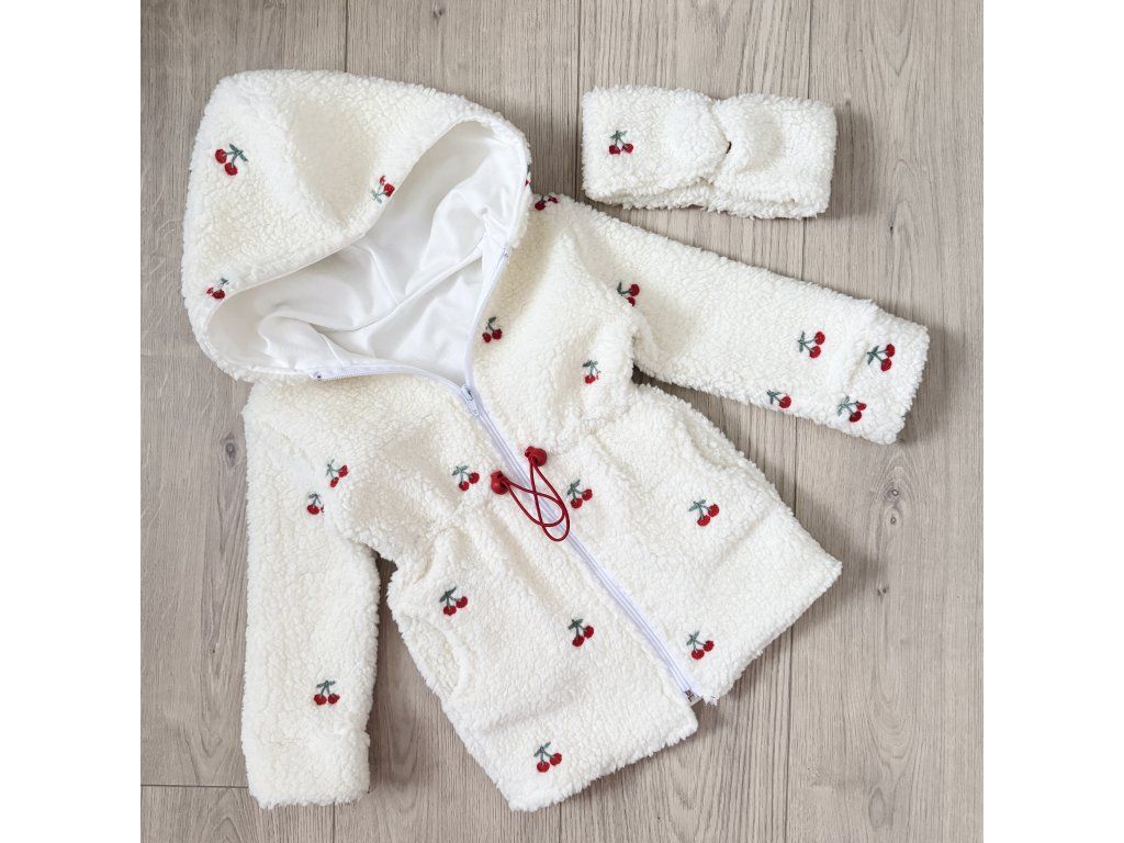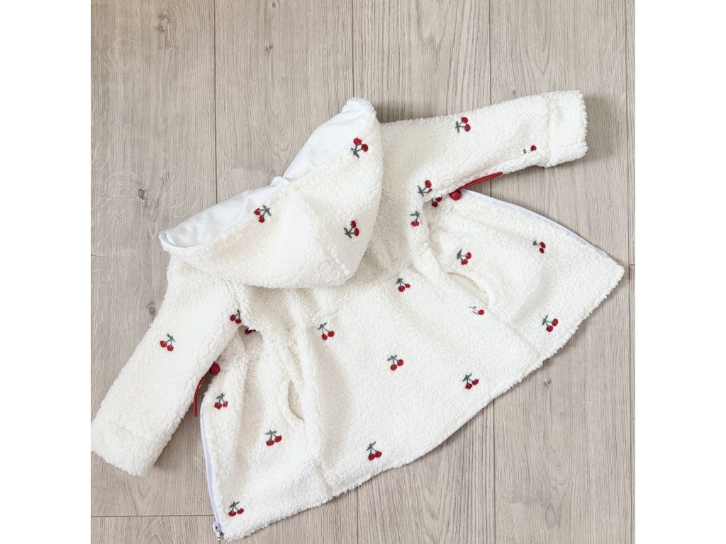 Teddy kabátik s výšivkami čerešní a sťahovaním v páse, je podšitý bavlneným úpletom.
