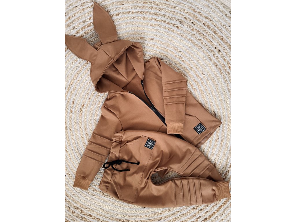 Bavlnená tepláková súprava na zips, s uškami na kapucni. Prešívané rukávy a nohavice zabezpečia jedinečnosť a chic štýl.