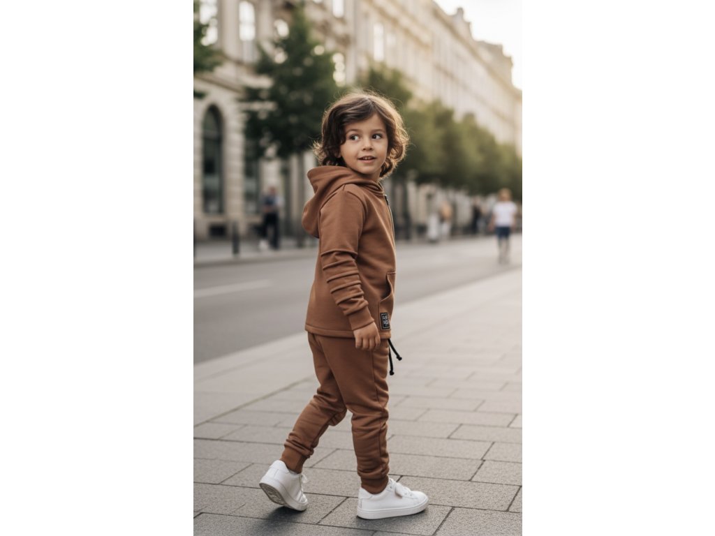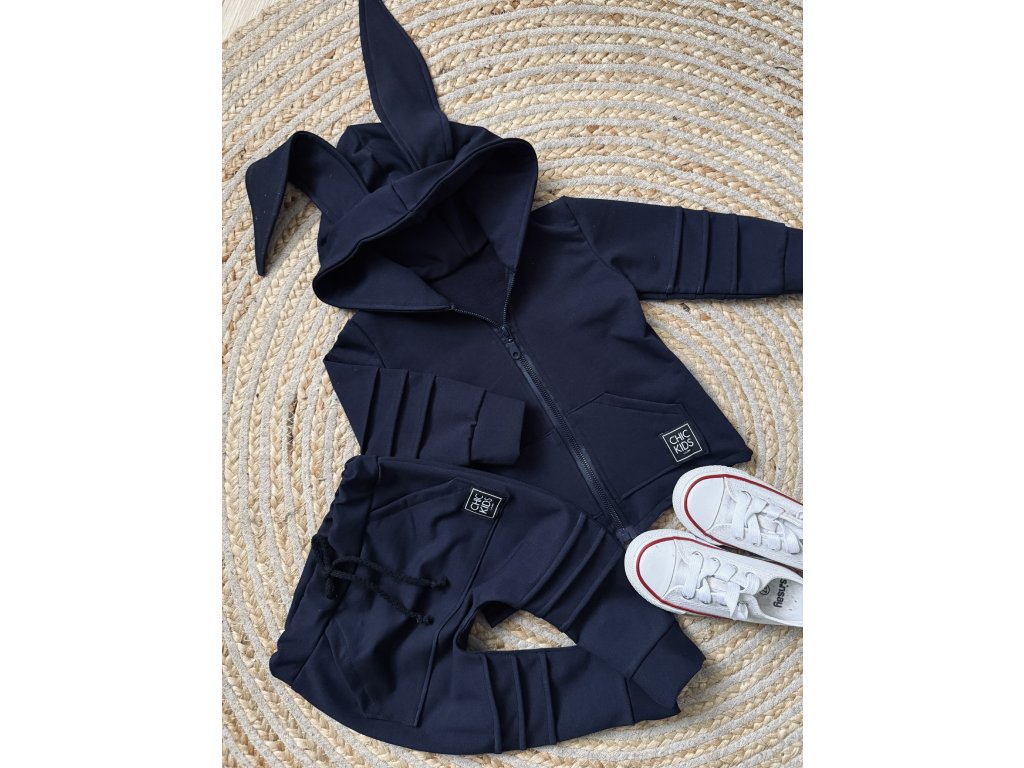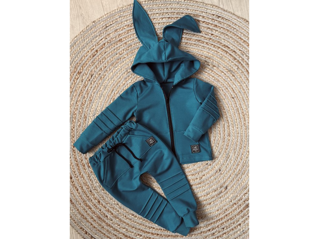 Prešívaná tepláková súprava s uškami na zips a praktickými vreckami na mikine aj teplákoch.