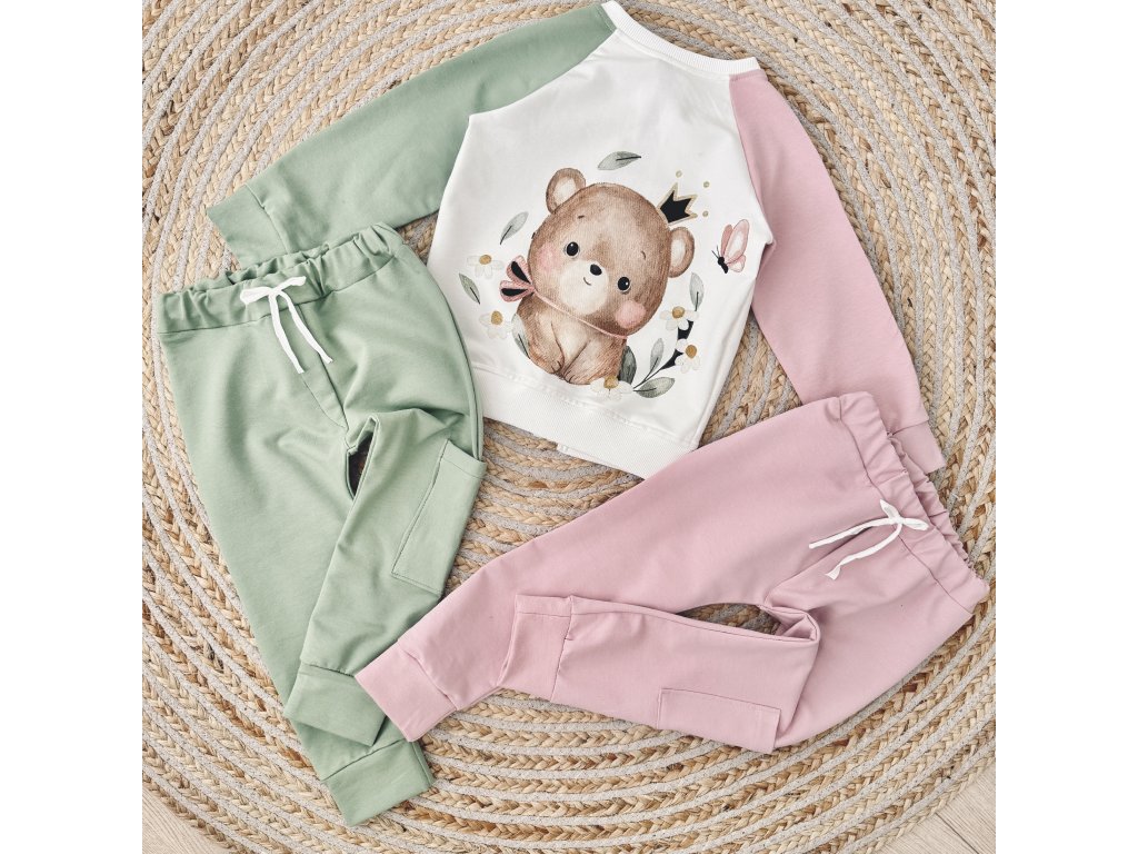 Roztomilá bavlnená detská súprava, ktorá spája jemné pastelové farby, hravý dizajn a maximálne pohodlie. Biela mikina s ilustráciou medvedíka s korunkou, motýlikom a kvetmi rozžiari každý deň vašich najmenších. Súprava je dostupná s výberom teplákov – zákazník si môže zvoliť pastelovo ružové alebo mentolovo zelené podľa preferencie.