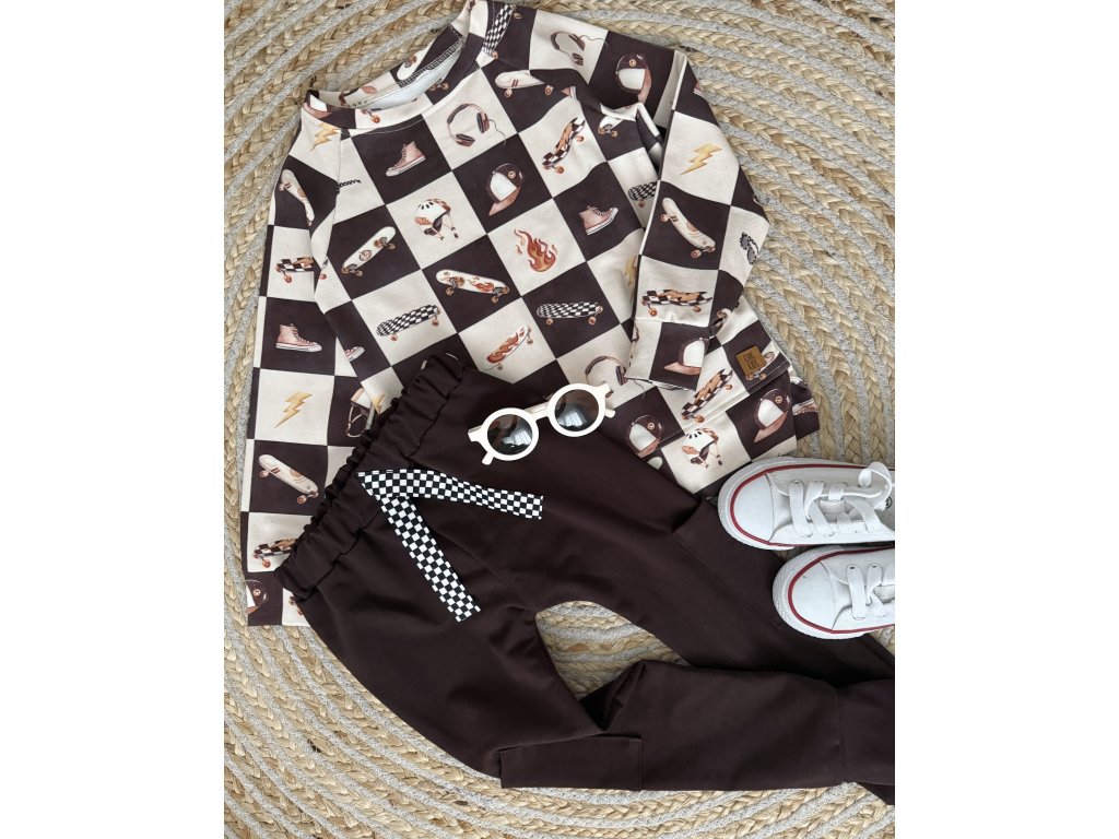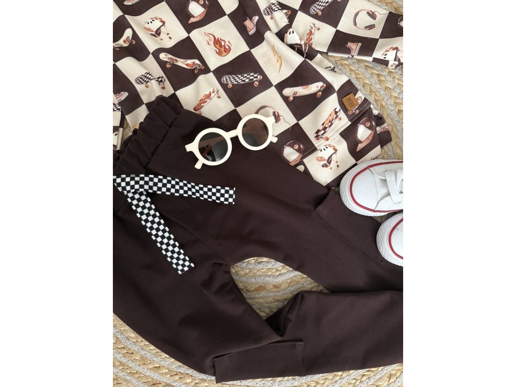 • Tmavohnedé nohavice s nastaviteľným pásom a čierno‑bielou károvanou šnúrkou pre pohodlné nosenie.